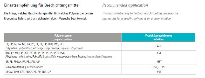 The table shows recommendations for using coating media based on the polymer system. The best results are determined more reliably through testing.
